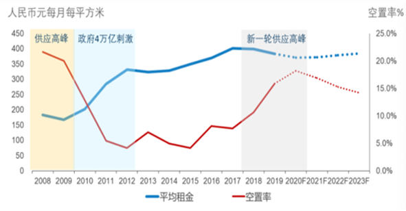其次,北京甲级写字楼市场空置率达到近十年阶段性高点。截止到2019年底,北京甲级写字楼的空置率达到15.9%,这也是从2010年以来的最高值。空置率高企主要就是因为从2018年开始,整体市场就进入了又一个供应高峰期。2018年的全年供应量达到近81万平方米,使得整体市场空置率突破10%的市场均衡点,达到10.6%。进入2019年,新项目陆续入市,加之2018年尚未完成去化的累计面积,导致空置率在一年间上升了5.3个百分点接近16%。同时,得益于相对稳定的市场需求,空置率的攀升得到了有效控制,但需要指出稳定的吸纳量得益于高品质新项目入市前的提前预租,预租对于空置率的影响大概在1%左右。预计本轮供应高峰将在2020年底基本结束,整体空置率水平也将在2020年触及最高值。