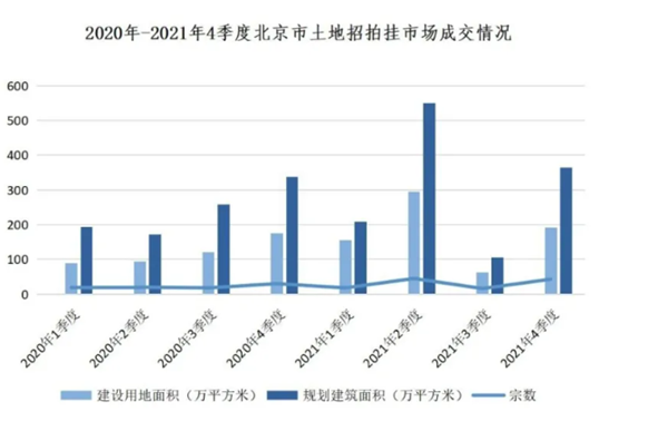 2021年4季度,北京市土地招拍挂市场供给成交43宗用地,均以挂牌方式出让。其中,住宅用地26宗、商业办公用地8宗。工业用地9宗。建设用地面积共计191.60万平方米,规划建筑面积共计363.50万平方米。其中,建设用地面积累计值为703.06万平方米,环比增加37.46%,同比增加47.10%;规划建筑面积累计值为1228.59万平方米,环比增加42.02%,同比增加27.85%。